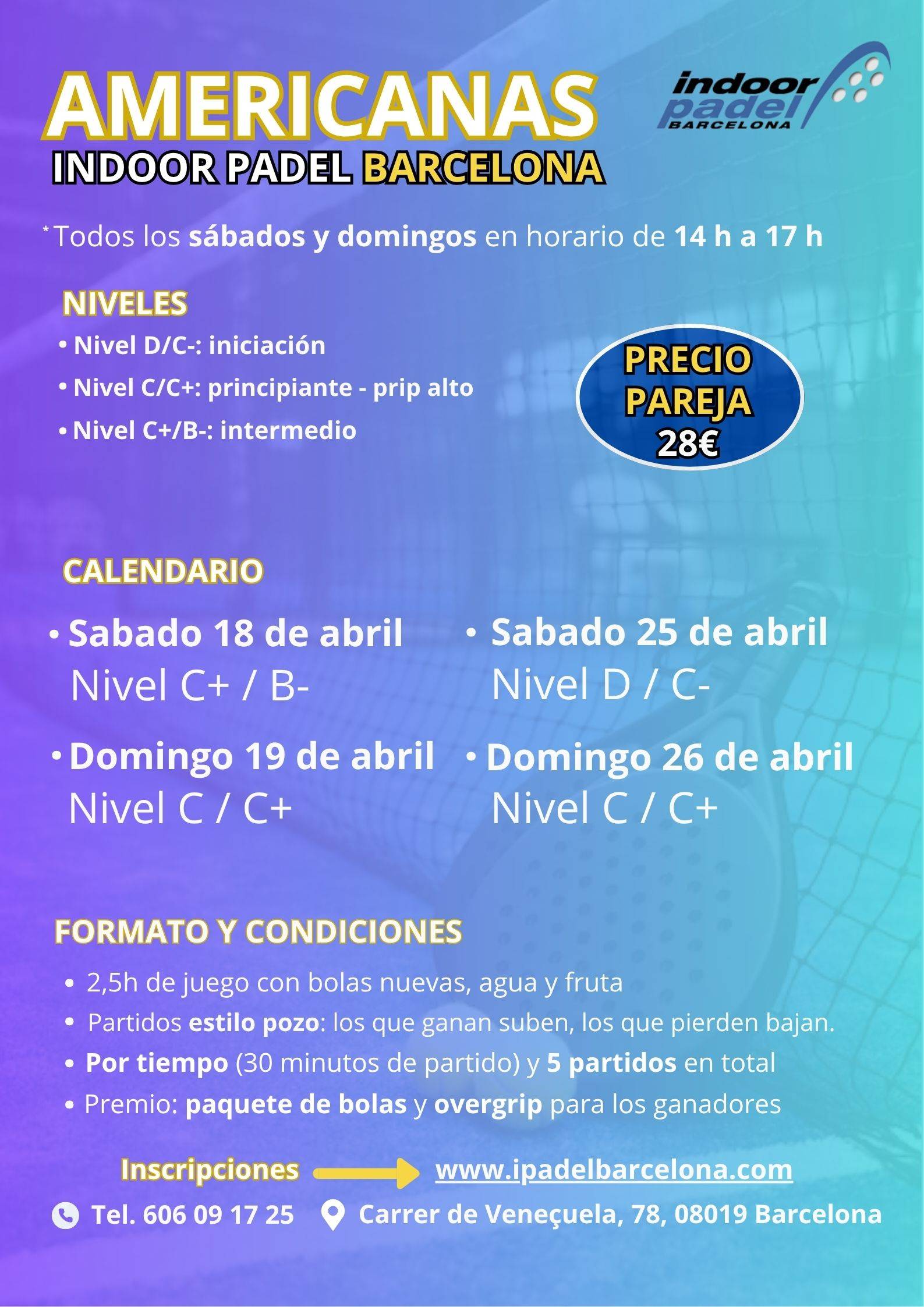Inscripción por parejas a través de la web (en el apartado americanas), busca la que mejor se adapte a tu nivel, todos los sabados y domingos en horario de 14h a 17h. Si no tienes pareja te ayudamos a buscar una llámanos al 606 09 17 25. Vamos!!